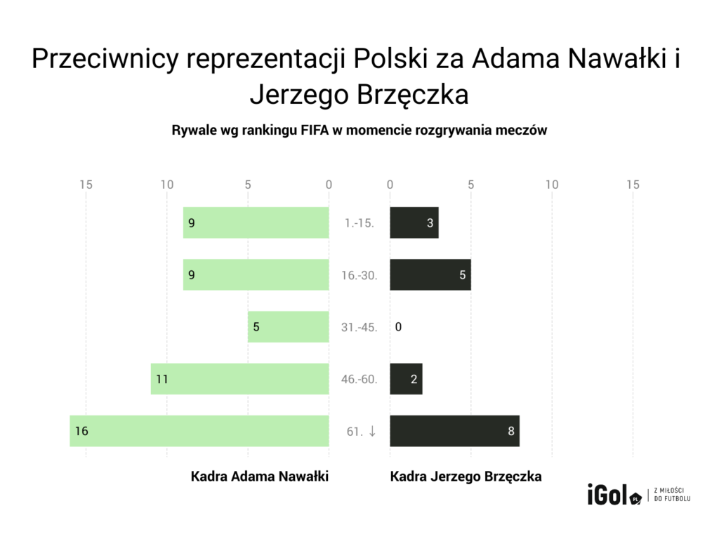 Adam Nawałka jako selekcjoner reprezentacji Polski prowadził ją w 50 meczach. Od początku swojej kadencji nie trafiał na mocnych rywali. Miał czas na stworzenie nowego rozdania, ale też nie wchodził od razu w najgłębszą wodę. Na pierwszego przeciwnika z pierwszej 30 rankingu FIFA tak naprawdę czekaliśmy do eliminacji do mistrzostw Europy 2016 i pamiętnego zwycięskiego meczu z Niemcami w Warszawie. Co prawda wcześniej mierzyliśmy się już z tym rywalem, ale wtedy Joachim Löw wystawił trzeci garnitur. Nasza kadra zremisowała 0:0, ale był to jeden z najnudniejszych meczów reprezentacyjnych w XXI wieku. Tak naprawdę większe przetarcie (mecz po meczu) ze światową czołówką mieliśmy dopiero na Euro 2016 i podczas meczów przygotowawczych do mundialu 2018. Wtedy już nasza kadra tak pięknie nie wyglądała.