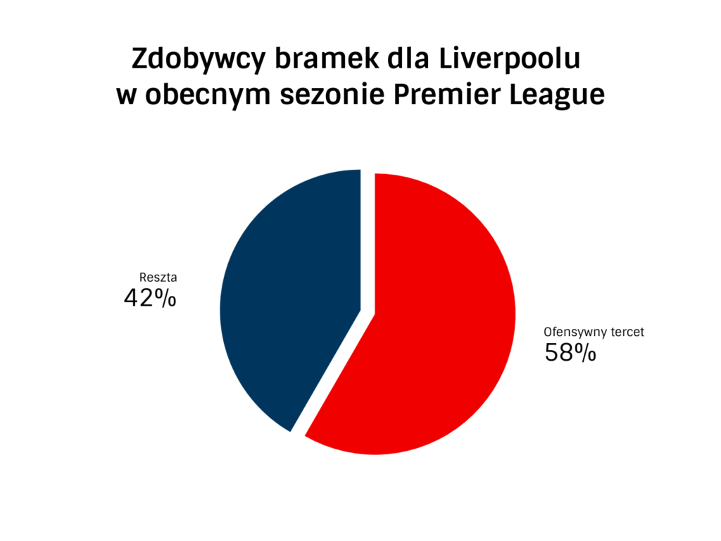 Zespołem jeszcze bardziej uzależnionym od dyspozycji przedniej formacji jest Liverpool. Mohamed Salah wraz z Sadio Mane i Roberto Firmino zdobyli aż 28 ze wszystkich 48 ligowych bramek dla „The Reds”. Jürgen Klopp zdecydowanie rzadziej rotuje zawodnikami przedniej formacji, stawiając na sprawdzone zestawienie. Choć często niektórzy atakujący gracze Liverpoolu są zmieniani przed końcowym gwizdkiem, to jednak czasu na boisku spędzają więcej od tercetu z Manchesteru City. Niemniej jednak liczba, a tym samym procent zdobytych bramek robią niemałe wrażenie.