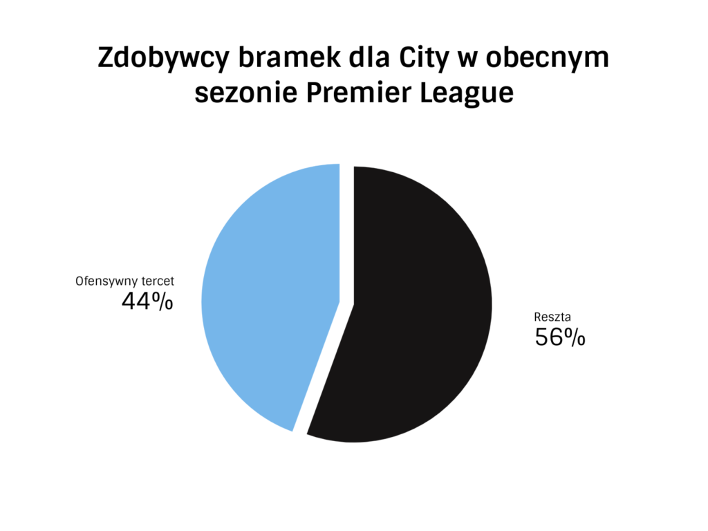 Ze wszystkich 54 trafień Manchesteru City w obecnym sezonie Premier League 24 było autorstwem tercetu Raheem Sterling – Sergio Agüero – Leroy Sane. Przy czym trzeba zaznaczyć, że żaden z nich nie wystąpił we wszystkich meczach bieżącej kampanii. Pep Guardiola dzięki pozyskaniu latem Riyada Mahreza nierzadko rotuje zawodnikami w zestawieniu przedniej formacji. Nie zważając jednak na czas gry poszczególnych piłkarzy, łatwo zauważyć na poniższym wykresie, że aż 44% wszystkich zdobytych bramek przez klub z Etihad Stadium jest zasługą ofensywnej trójki.