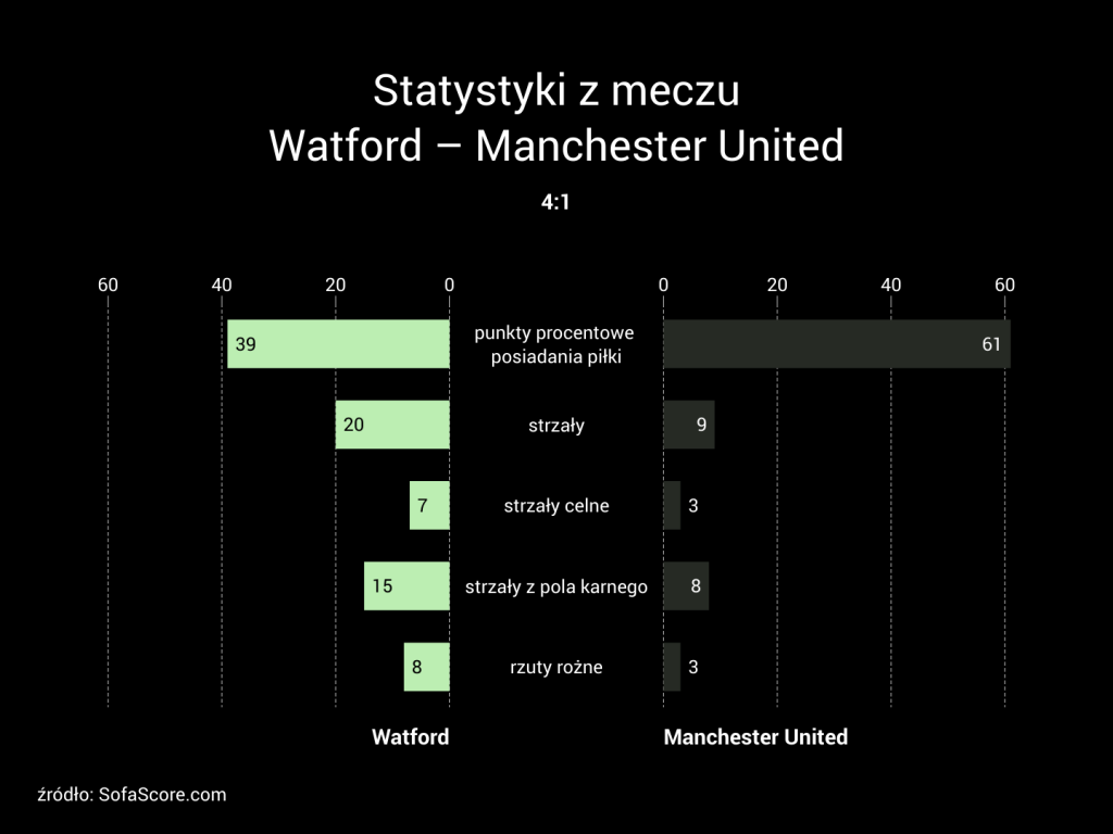 Można powiedzieć, że bardzo bolesnym, ale idealnie zwieńczającym ostatnią grę United pod wodzą ich byłego zawodnika. „Czerwone Diabły” wyglądały żałośnie, a „Szerszenie” w pełni wykorzystały ich słabości. Na załączonym obrazku możemy zauważyć statystyki z całego spotkania. Warto na nie zerknąć, gdyż wyglądają dość znamiennie.