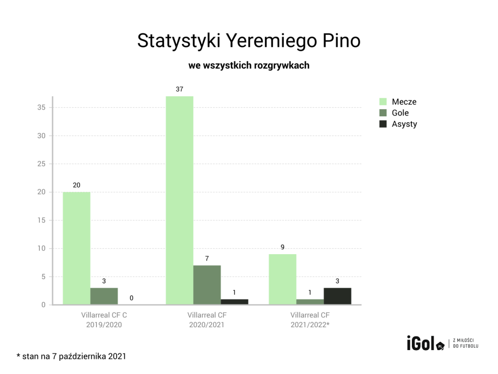 Aż trudno uwierzyć, że sezon 2020/2021 był jego pierwszym w La Liga. Yeremi Pino wcześniejszy rok spędził w drużynie Villarreal C, a następnie miał przejść do drużyny B. Unai Emery szybko zauważył w młodym zawodniku duży potencjał. Od październikowego debiutu w barwach pierwszej drużyny „Żółtej Łodzi Podwodnej” zaczynał otrzymywać kolejne szanse, choć najczęściej kilkunastominutowe. Początkowo jako rezerwowy, ale z upływem kolejnych tygodni zapracowywał sobie na większy kredyt zaufania. Swojego pierwszego gola zdobył 21 października 2021 w meczu Ligi Europy przeciwko Karabachowi Agdam (3:1). W lidze na jego premierowe trafienie trzeba było poczekać do połowy grudnia.