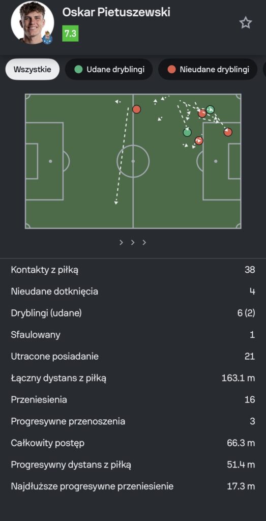 W meczu FC Porto z Rio Ave Oskar Pietuszewski znów był jedną z najbardziej wyrazistych postaci na boisku. Porto wygrało 1:0, a kluczowa akcja należała do niego. Pokazał to, co lubi robić, czyli progresywne wyjście za obronę i rajd w stronę bramki rywala. Ponownie pokazał to, co udało się nam dostrzec w innych spotkaniach. Dużo poruszał się bez piłki, był odważny w pojedynkach. Warto w tym miejscu podkreślić, że Oskar jest niesamowicie wertykalny w swoim graniu. Mowa tutaj o momentach gry z pierwszej piłki i ekwilibrystycznych zagraniach. Kilka razy wszedł w drybling bez kalkulacji, nie zawsze z dobrym efektem. Miewał momenty chaotyczne, gdy próbował zrobić za dużo naraz. Jednakże to należy zrzucić na barki jego wieku.