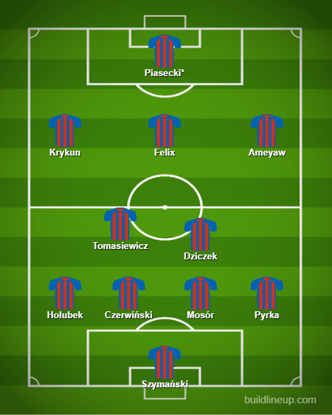 W linii defensywnej nastąpi drobna zmiana – w miejsce Katranisa wskoczy Holubek. W pomocy na pewno oglądać będziemy Patryka Dziczka, który chyba już na stałe wskoczył do kadry Michała Probierza. Pozostałe dwa miejsca obsadzą Grzegorz Tomasiewicz, Michał Chrapek oraz Jorge Felix, będą rotacje. Na skrzydłach Krykun i Ameyaw. Swoje minuty dostanie też Damian Kądzior. W ataku liczby zapewnić będzie miał nowy nabytek Fabian Piasecki. Kamil Wilczek i Gabriel Kirejczyk będą jednak na niego naciskać.