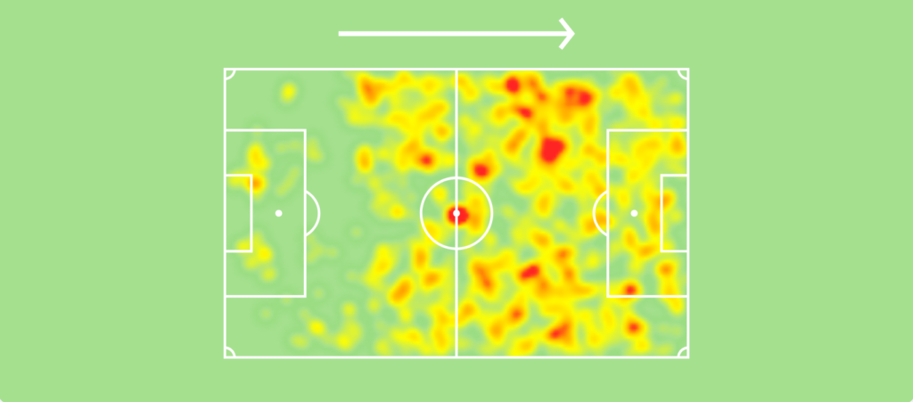 Dziwnie to brzmi, jeśli o mierzącym 190 centymetrów wzrostu zawodniku mówi się, że znika z pola widzenia. Kai Havertz nie jest klasycznym przykładem napastnika. W taktyce preferowanej przez trenera w zależności od spotkania występuje w różnych sektorach boiska. Zdarza się, że w trakcie meczu schodzi niżej do rozegrania lub ucieka do boku. Jest po prostu wszędzie, co obrazuje jego heatmapa z tego sezonu.