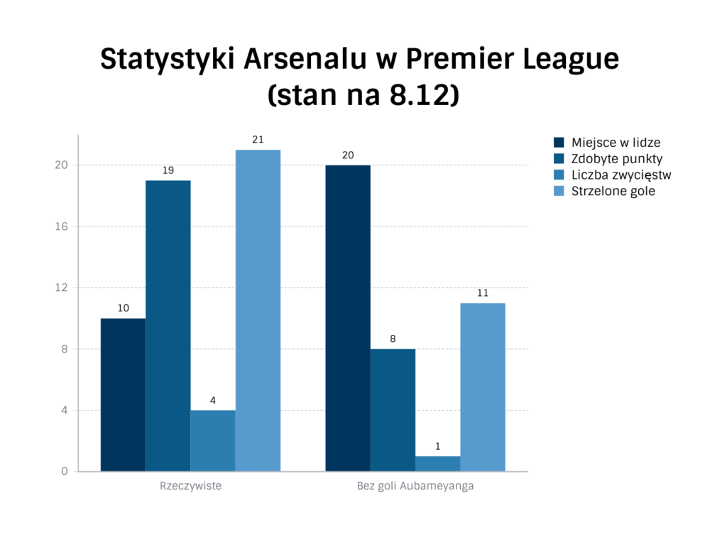 Kanonierzy obecnie są w pełni zależni od Gabończyka. I nie są to jedynie puste slogany, ale fakty, które łatwo oprzeć o różnorakie statystyki. Gdyby wyjąć z dorobku Arsenalu w lidze gole Aubameyanga, to okazałoby się, że „Kanonierzy” okupowaliby dno tabeli, mając zaledwie jedno zwycięstwo i osiem zdobytych punktów (wykres poniżej). Oczywiście, żeby te wyniki były miarodajne względem innych zespołów Premier League, to im też trzeba by było odjąć gole strzelone przez najlepszego snajpera. Jednakże ma to przede wszystkim na celu pokazanie skalę problemu „Kanonierów” i tego, jak obecnie są zależni od jednego człowieka. Bez goli i skuteczności Pierre’a z londyńską drużyną byłoby znacznie gorzej, niż jest w tym momencie.