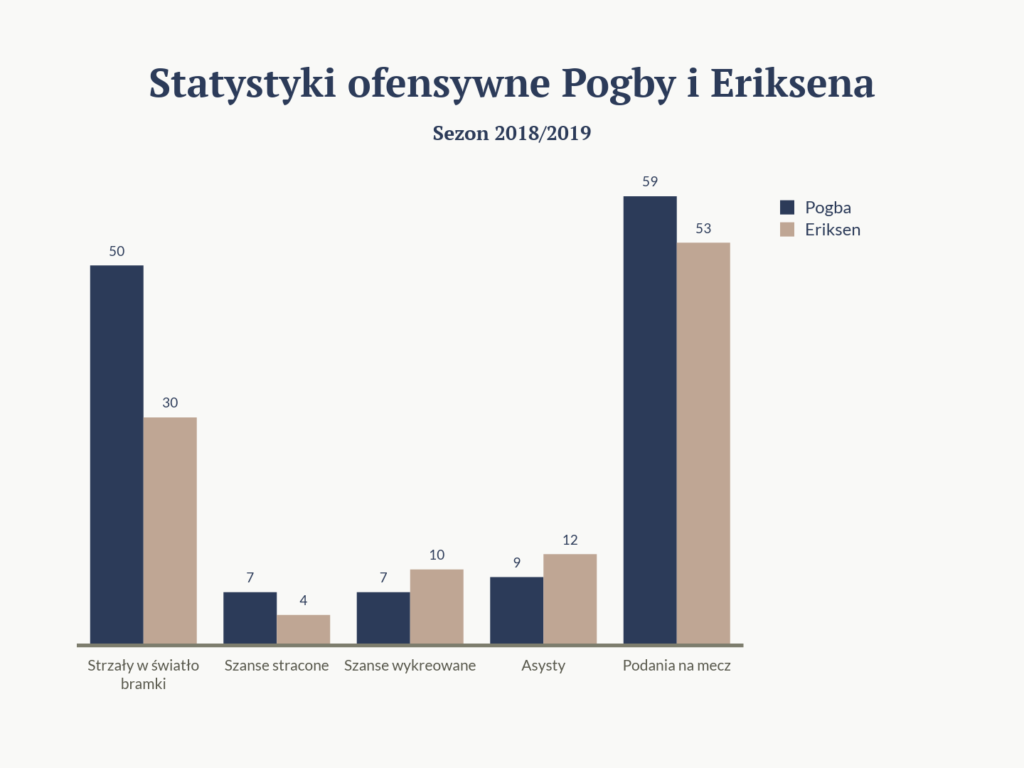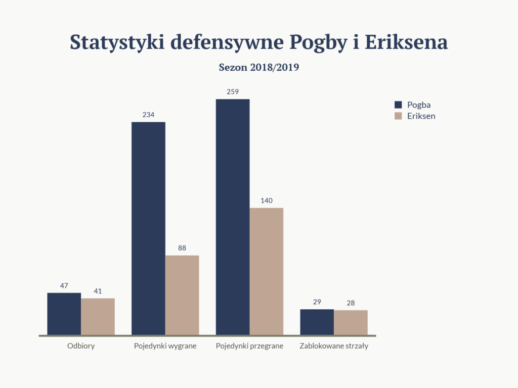 W tym zestawieniu widać, że z dwójki piłkarzy więcej w grę defensywną angażuje się Francuz. Jednak nic w tym dziwnego. Pogba zawsze grywał jako typowy środkowy pomocnik, który miał za zadanie biegać z jednej połowy na drugą. Nie zawsze wypadał w niej dobrze, jednak tutaj trzeba przyznać mu wyższość. Eriksen to piłkarz typowo ofensywny, który do defensywy cofa się wtedy, kiedy musi.