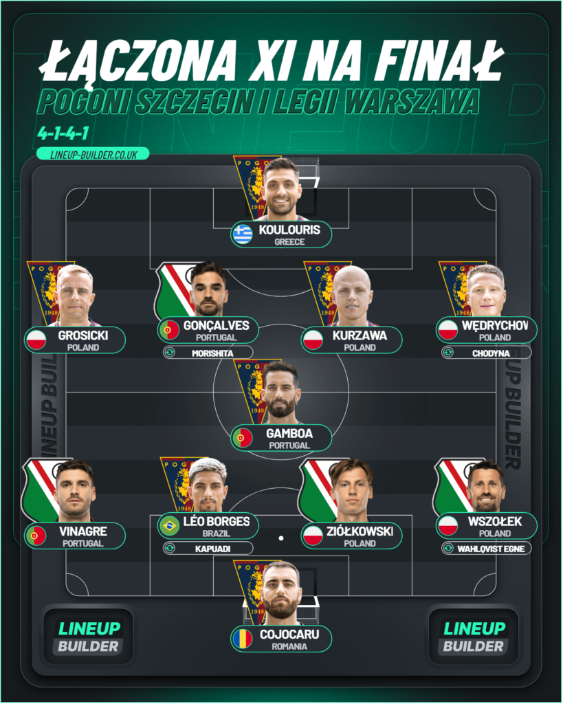 Tak prezentuje się nasza łączona jedenastka na finał Pucharu Polski. W rywalizacji Pogoń – Legia to ci pierwsi mają naszym zdaniem teoretycznie lepszy pierwszy skład na finał, ale „Wojskowi” mają lepszą ławkę, która może zrobić różnicę.