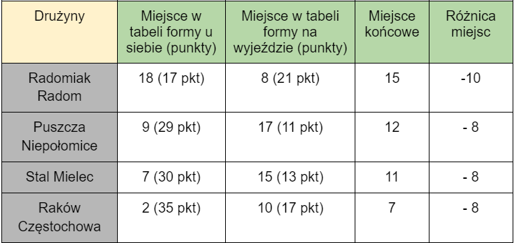W ubiegłych rozgrywkach na miano najnierówniej grającej drużyny zasłużył Radomiak Radom. W meczach domowych zaprezentował się on iście katastrofalnie, zajmując ostatnie miejsce. Tym, co uratowało „Zielonych” od pewnej degradacji, była forma drużyny na wyjeździe. Tam zdobyli 21 punktów, co dało im ostatecznie 8. miejsce pod tym względem w lidze. Summa summarum ledwie uciekli od spadku, kończąc sezon na 15. miejscu.