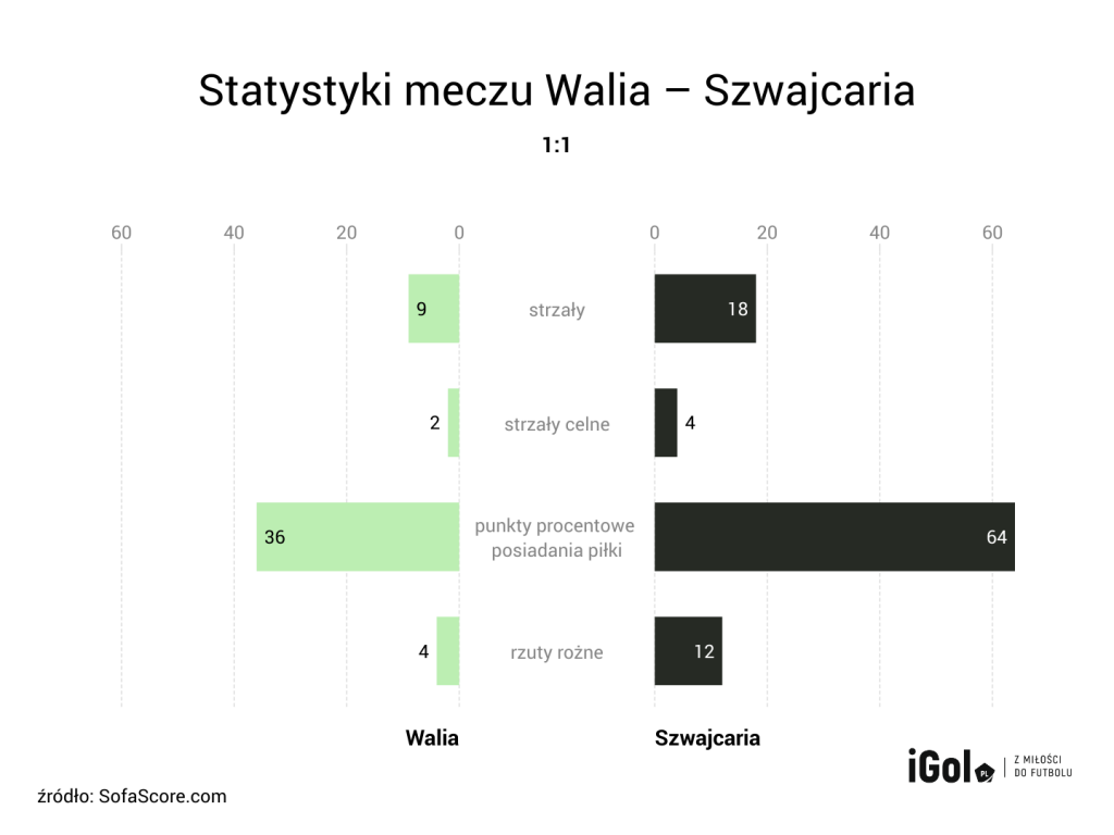 Walijczycy bez wątpienia mogą być zadowoleni po pierwszej serii gier. Podopieczni Roberta Page’a zdołali zremisować z ekipą Vladimira Petkovicia 1:1. „Smoki” miały sporo szczęścia, ponieważ „Nati” była nadzwyczaj nieskuteczna. Można to wywnioskować, przeglądając nawet same statystyki spotkania.