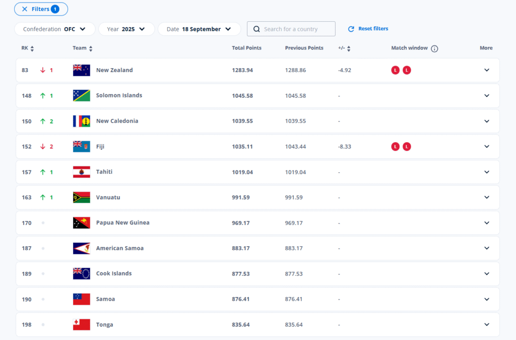 To właśnie różnica poziomów między europejskimi drużynami a zespołami z Oceanii sprawia, że takie mecze nie są szczególnie atrakcyjne sportowo. W aktualnym rankingu FIFA Polska zajmuje 36. miejsce, podczas gdy wszystkie drużyny z Oceanii poza Nową Zelandią znajdują się poniżej setnego miejsca. Spójrzcie na zdjęcie z oficjalnego rankingu FIFA.