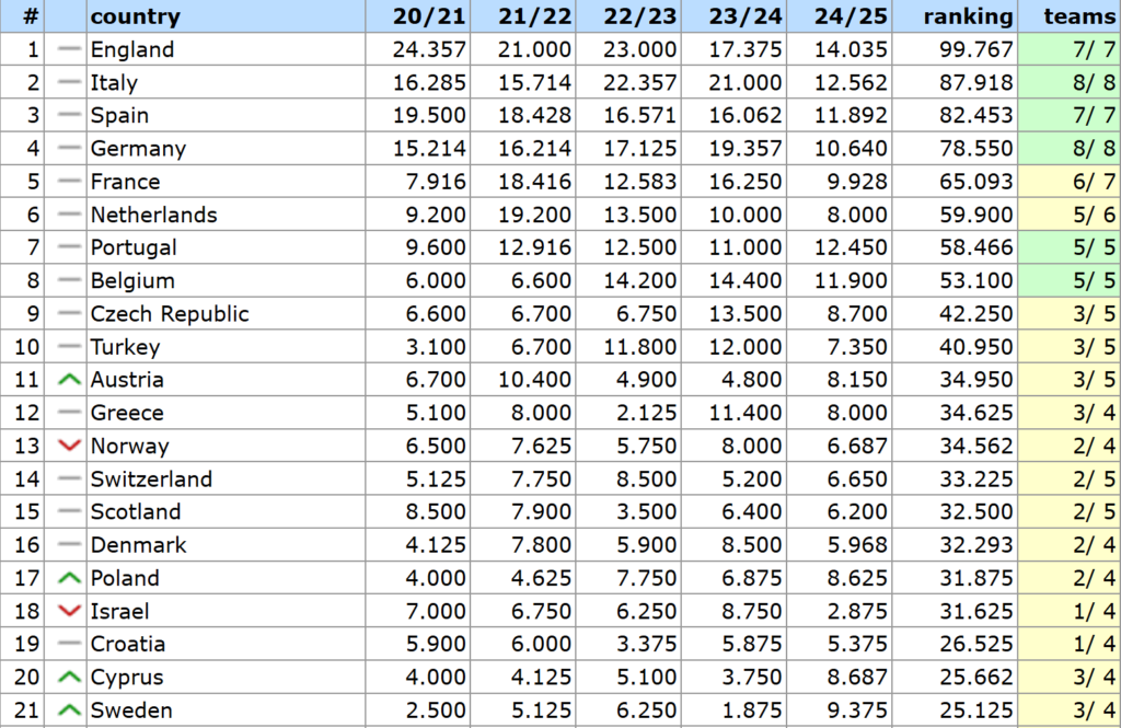 Screenshot ze strony kassiesa.net pokazujący aktualny ranking krajowy UEFA