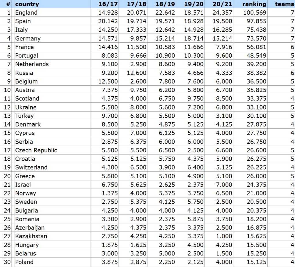 Screenshot ze strony kassiesa.net pokazujący ranking krajowy UEFA z lat 2016/2017 – 2020/2021