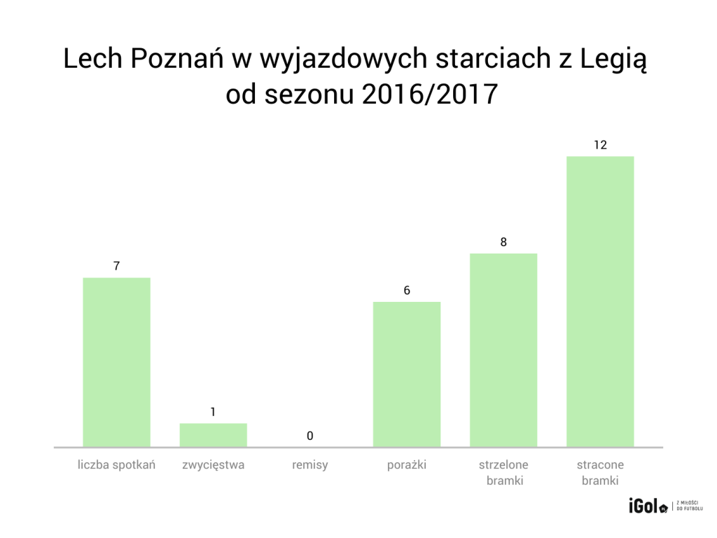Na przestrzeni pięciu minionych lat „Kolejorz” pokonał Legię na jej terenie tylko raz… Było to starcie w ramach Superpucharu Polski, rozegrane 7 lipca 2016 roku. Od tamtej pory „Poznańska Lokomotywa” nie potrafi przeciwstawić się graczom z centralnej Polski.