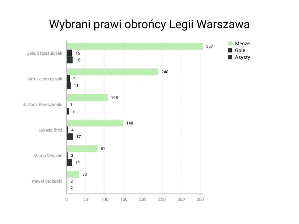 Powyższe przykłady pokazują, że prawa obrona w Legii na przestrzeni ostatnich lat była bardzo silnie obsadzona. Oto, jak prezentują się statystyki wypracowane w stołecznej drużynie przez wymienionych piłkarzy oraz Marko Vesovicia i Pawła Stolarskiego. Warto dodać, że Jędrzejczyk, Vesović i Stolarski wciąż mogą poprawić swoje liczby.