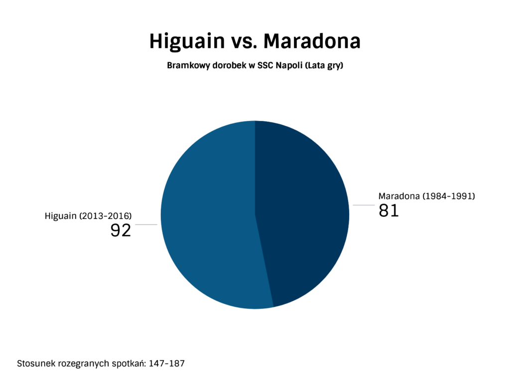 O wyjątkowości neapolitańskiej przygody „El Pipity” (fajeczka – pseudonim Higuaina) świadczy zapewne fakt, iż ze swoimi 36 bramkami ustanowił ligowy rekord w trafieniach jednego sezonu. Takiego strzeleckiego bilansu nie odnotowano na włoskich arenach w całej historii rozgrywek, a podobny wyczyn miał miejsce 66 lat temu. Dokonał tego były gracz Milanu, Szwed Gunnar Nordahl, choć jego bramkowe konto zatrzymało się na liczbie 35 trafień. Co ciekawe, uznawany za prawdziwego światowego wojownika Maradona w swoim popisowym dla siebie europejskim sezonie zdołał ustrzelić zaledwie 16 goli. Z przebiegu upływającego czasu wynika, iż 25 lat później do stolicy Kampanii zawitał nowy, mający znakomitą skuteczność argentyński egzekutor.