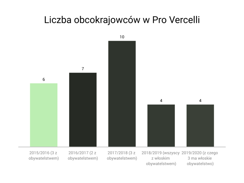 Jak widać na załączonym wykresie, liczba obcokrajowców po spadku do Serie C (spadli po sezonie 2017/2018) znacznie zmalała, niż gdy grali poziom wyżej. W Vercelli zdecydowano się na cięcie kosztów i postawienie na swoich. Dodatkowo nawet ci piłkarze zagraniczni legitymują się włoskim obywatelstwem i często są to gracze mieszkający na Półwyspie Apenińskim od lat. We Włoszech czują się oni jak u siebie i można ich uznać za Włochów z krwi i kości.