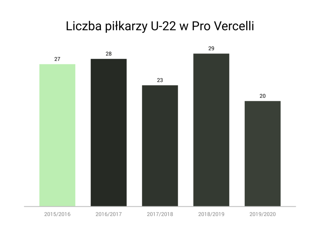 Nie, te liczby nie są błędem i redaktor nie tworzył wykresu po wypiciu arbuzowego Somersby. Pro Vercelli faktycznie w kadrze w ostatnich sezonach miało aż tylu młodych piłkarzy. Co prawda często te kadry liczyły blisko 40 zawodników, jednak wciąż znaczna większość z nich łapałaby się wiekowo jako młodzieżowcy w naszej rodzimej ekstraklasie. Jest to imponujące i miejmy nadzieję, że taki trend utrzyma się jak najdłużej.
