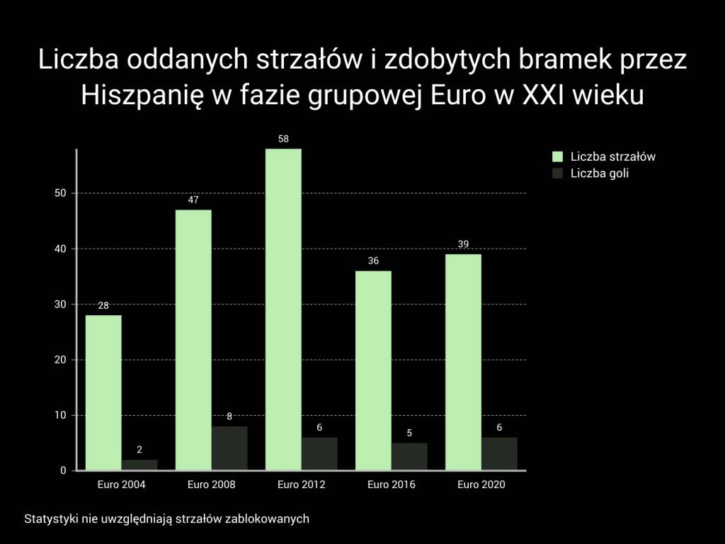 Duet Alvaro Morata – Gerard Moreno ma największy ujemny stosunek liczby goli do współczynnika xG, problem w ataku jest bardzo wyraźny. To pokazuje skalę problemu w hiszpańskim zespole. Jakkolwiek patrzeć, może to dziwić. Obok wspomnianej dwójki grają tacy zawodnicy, jak: Dani Olmo, Ferran Torres, Pablo Sarabia czy Pedri. Nawet Marcos Llorente, który nominalnie występuje w środku pomocy, jest obecnie wystawiany na prawej obronie. Piłkarz Atletico wraz z Jordim Albą napędza ataki „La Furia Roja” w bocznych sektorach boiska. Hiszpanie grają wysoko i dużą liczba graczy. Co z tego, skoro nie ma to przełożenia na zdobycz bramkową. Hiszpania nie oddaje tylu strzałów na bramkę co w 2008 i 2012 roku, czyli w okresie swojej świetności. Za to w 2016 roku rzadziej uderzała, a zdobyła tylko gola mniej.