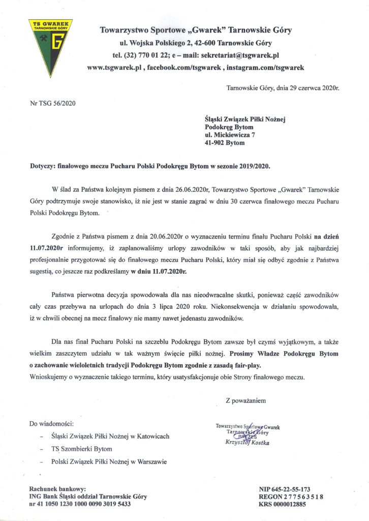 Prezes Wyszyński potwierdza i dodaje: – Termin 30 czerwca został wyznaczony z końcem maja. Kluby zostały o tym poinformowane. Na wniosek Gwarka Tarnowskie Góry kluby mogły ten termin negocjować między sobą. Nie odpowiadał on Gwarkowi, bo do końca czerwca mieli zawodników na urlopach. Gwarek otrzymał zgodę, że o ile oba kluby zgodzą się na inny termin, mecz będzie można przełożyć.