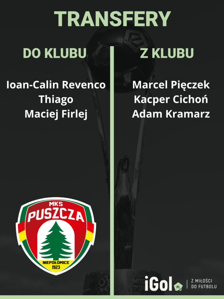 Puszcza nie szalała na rynku transferowym jednak drużynę zasiliło kilku zawodników. Znany w klubie Thiago (wcześniej wypożyczony) dołączył po rozstaniu z Cracovią, z Ruchu Chorzów pozyskano napastnika Macieja Firleja, ale wisienką na torcie jest zatrudnienie reprezentanta Mołdawii Ioana-Calina Revenco, który przyszedł z Petrocub Hincesti.