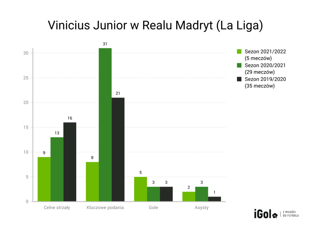 „Vini” na początku sezonu 2021/2022 naprawdę wydaje się namiastką Neymara. Do popisów technicznych, udanych dryblingów, przyjęć „raboną” dokłada naprawdę kompletne liczby. To nie jest już jeden, dwa mecze z rzędu. Skrzydłowy Realu Madryt pozostaje w formie już od miesiąca, zaczyna się robić regularny. Co być może nawet ważniejsze, grając słaby/przeciętny mecz, potrafi skończyć go z golem i asystą. Po tym poznaje się wielkich zawodników.