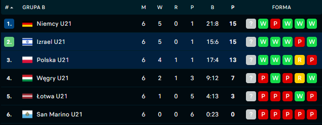 Po sześciu rozegranych spotkaniach młodzieżowa reprezentacja Polski zajmuje trzecie miejsce. Mamy stratę dwóch punktów zarówno do drugiego Izraela, jak i będącej na pierwszym miejscu reprezentacji Niemiec. (zdj. flashscore)