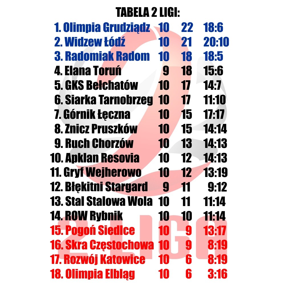 Do 1. ligi awansują tylko trzy drużyny, a kandydatów jest więcej. Wśród drużyn walczących o przepustkę do wyższej ligi wymienia się Widzew, Ruch, Olimpię Grudziądz, Radomiaka, Siarkę, Górnika czy GKS. Odważnie zmagania w 2. Lidze zaczęła Elana Toruń, która też kręci się w ligowej czołówce. Różnica punktowa między 3. miejscem a środkiem tabeli nie jest taka duża. Trochę gorzej to wygląda, jeśli chodzi o dół tabeli, bo Rozwój Katowice i Olimpia Elbląg wyraźnie odstają od reszty stawki. Skra Częstochowa do niedawna też była mocnym outsiderem, ale w ostatnim czasie zaczęła poprawiać swoje notowania.
