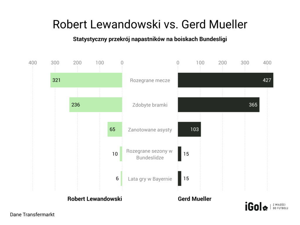 Jeśli przyjrzymy się jednak temu, co na przestrzeni lat wypracowali dwaj wspomniani piłkarze, zdecydowana przewaga jest po stronie rywala. Legendarny egzekutor z lat 70. rozegrał dla Bayernu ponad dwa razy więcej spotkań, strzelając przeszło dwukrotnie większą liczbę goli. Należy jednak pamiętać, że dzieli ich dziewięcioletnia różnica stażu gry w Monachium oraz pięcioletnia w występach na najlepszych niemieckich boiskach. W obu tych rozbieżnościach zdecydowaną liczbową zaliczkę ma były reprezentant Niemiec, który na rodzimych arenach spędził aż piętnaście wiosen.