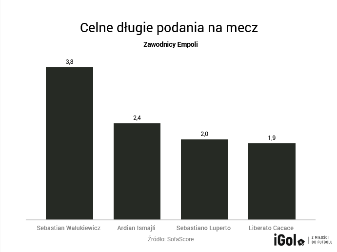 Kibice pamiętający Walukiewicza z czasów Pogoni Szczecin wiedzą, że jego atutem było także dobre wyprowadzanie piłki. W połączeniu z jego techniką użytkową wyglądało to wtedy bardzo obiecująco. Właśnie z tego poza skutecznymi interwencjami coraz bardziej nasz defensor słynie w Empoli. Regularna gra dodatkowo oczywiście dalej rozwija go w tym aspekcie. Sebastian Walukiewicz ma najwyższy procent celnych podań w drużynie (85% – tyle samo co jego partner z obrony Ardian Ismajli). Większe wrażenie robi jednak statystyka celnych długich podań na mecz. Tutaj już mamy totalną deklasację. Nikt w Empoli nie może nawet dorównać Walukiewiczowi w tej kwestii.