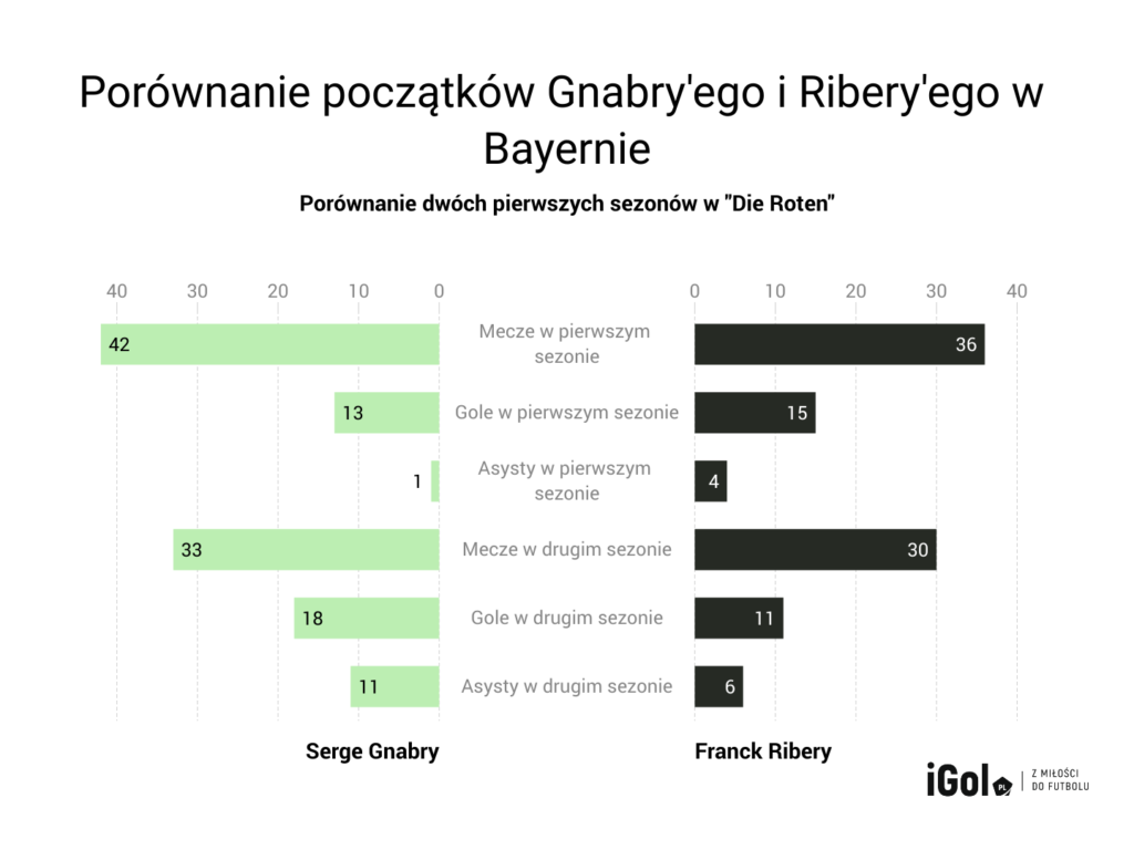 Gdy Gnabry przechodził do Bayernu, nikt nie myślał, że będzie mógł zastąpić Ribery’ego, raczej myślano o nim jako o dobrym zmienniku. Niemiec jednak już w pierwszym sezonie pokazał, że będzie można na niego liczyć. Porównując statystyki obu piłkarzy z dwóch pierwszych sezonów w Monachium, to właśnie Gnabry wypada lepiej.