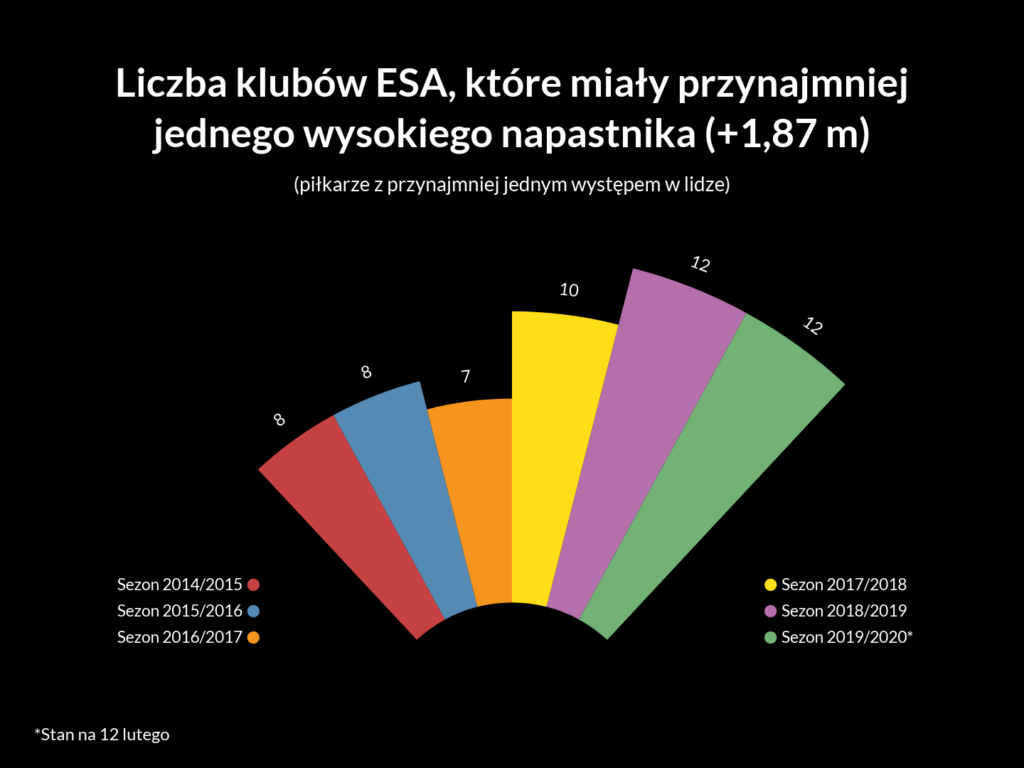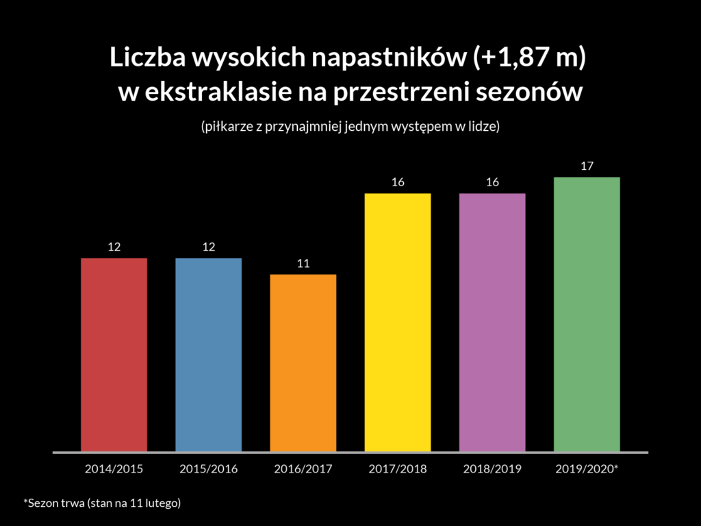 Od 11 do 17 w niecałe trzy lata. Ktoś mógłby powiedzieć, że to wcale nie tak dużo. I, szczerze mówiąc, miałby rację, gdyby nie fakt, że mowa już o utartej tendencji, która zmierza w kierunku kolejnej poprzeczki na poziomie 20 piłkarzy. Od sezonu 2017/2018 średnio każdy klub w najwyższej klasie rozgrywkowej w Polsce posiada w kadrze wysokiego napastnika, co w przeszłości nie było normą. A przecież trzeba pamiętać, że koniec okienka transferowego w Polsce przypada dopiero na 2 marca, więc te liczby mogą jeszcze wzrosnąć. Głównie za sprawą obcokrajowców, bo ich w tym zestawieniu jest najwięcej. Najświeższy przykład? Tomas Pekhart (artykuł o nim tutaj).