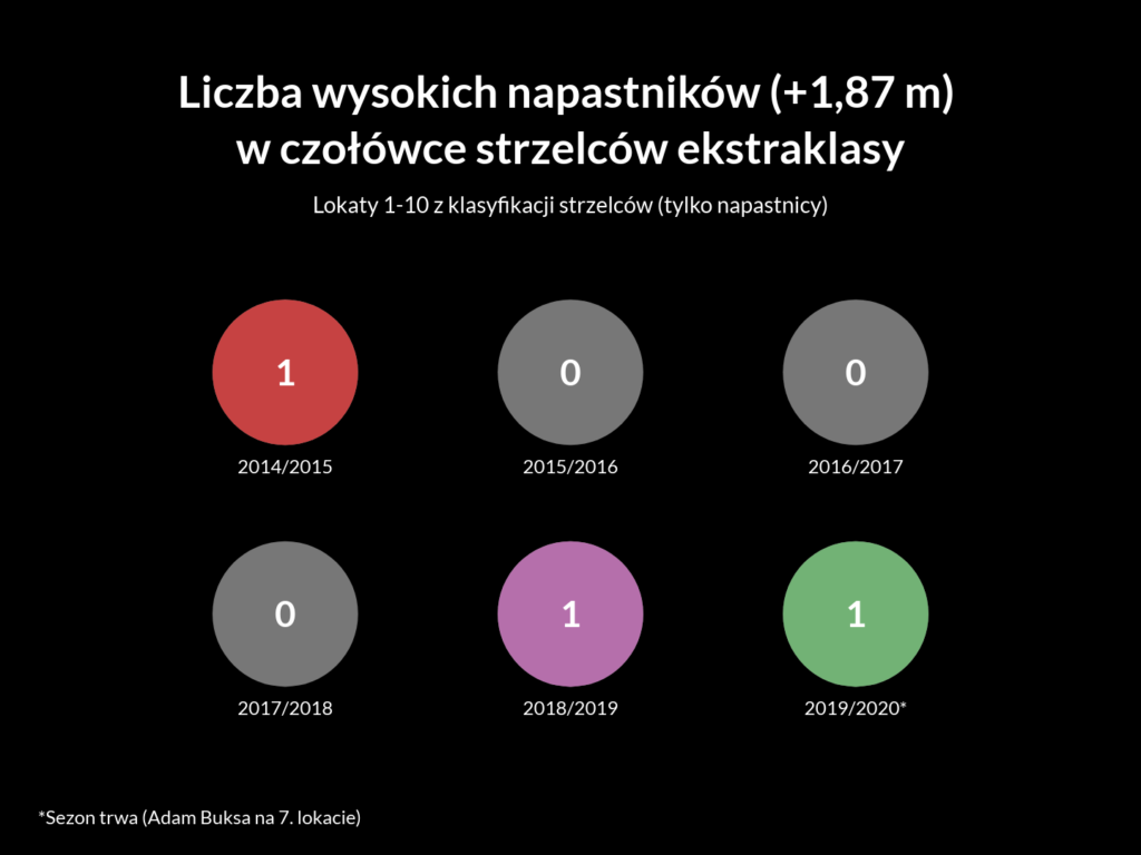 Ostatnim napastnikiem mierzącym ok. 190 cm, który przebywał wśród czołówki strzelców ekstraklasy, był Łukasz Teodorczyk w sezonie 2013/2014 (20 goli).