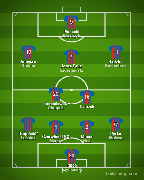 W pierwszym składzie Piasta dojdzie do kosmetycznych zmian. Na lewej obronie miejsce powinien zająć sprowadzony latem Drapiński. Mosóra, który prawdopodobnie odejdzie, na środku obrony zastąpi ktoś z trójki Huk, Munoz, Reiner. Dopóki nie ma jednak oficjalnego potwierdzenia, umieszczamy go w naszej jedenastce. Rzutem na taśmę może wskoczyć do niej także Damian Kądzior.