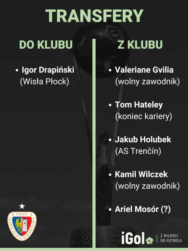 Z Piasta na ten moment odeszło natomiast czterech piłkarzy (ponadto na dniach barwy zmienią prawdopodobnie także Ariel Mosór i Michał Kaput). Tom Hateley ogłosił zakończenie kariery, kontrakty Kamila Wilczka i Waleriana Gwilii nie zostały przedłużone, a Jakub Holubek przeniósł się do Trenczyna.