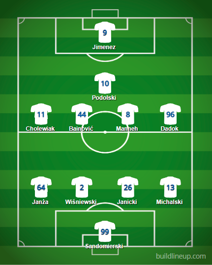 W środku pola do łask wrócił Bainović, u jego boku właściwie pewny gry wydaje się Manneh. Cały czas w gotowości pozostaje Nowak, choć najprawdopodobniej będzie zmiennikiem Lukasa Podolskiego. Ten będzie występował za plecami napastnika, Jesusa Jimeneza. Na bokach operować powinni Cholewiak oraz Dadok – nowi piłkarze Górnika Zabrze nie mają większej konkurencji na swoich pozycjach.