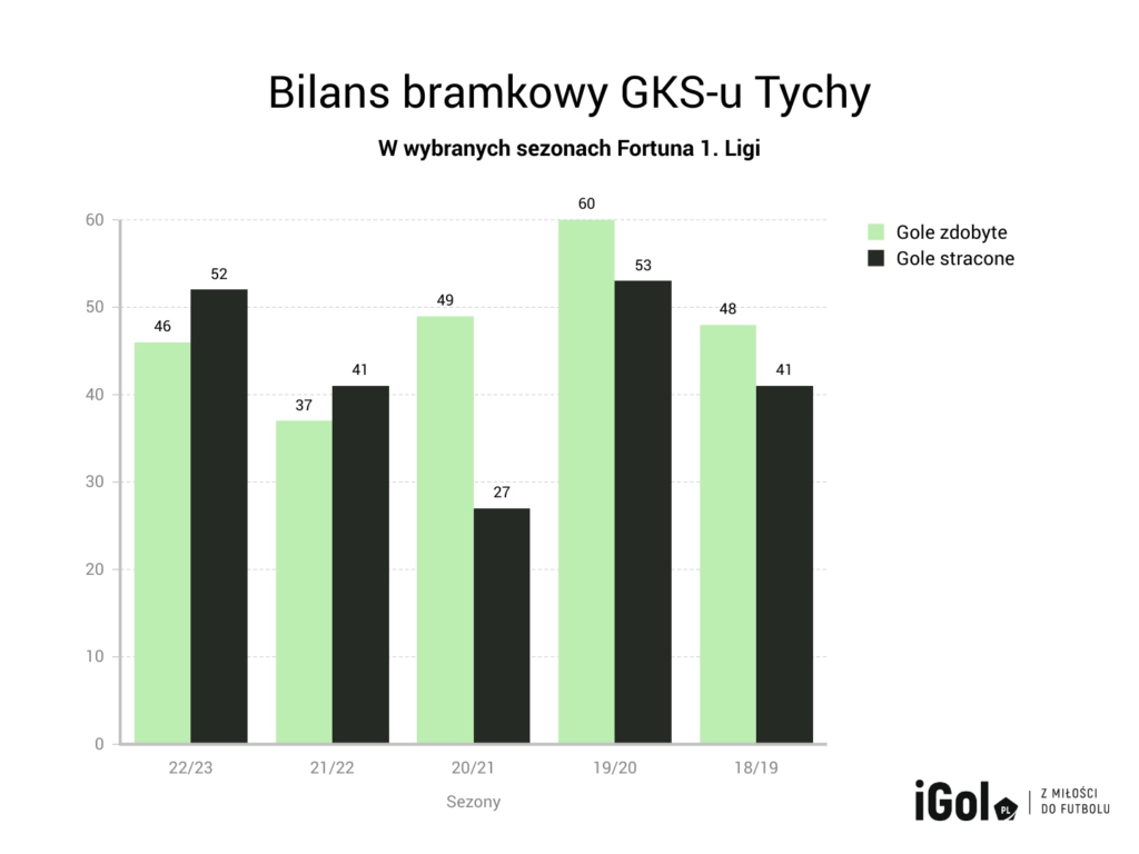 Wystarczy zresztą spojrzeć na ostatnie sezony, które GKS Tychy spędził w Fortuna 1. Lidze. Poniższa grafika pokazuje podstawowe statystyki GKS-u Tychy w ostatnich pięciu sezonach. Tylko raz, w niezwykle udanym sezonie, kiedy tyszanie zajęli trzecie miejsce w lidze, stracili oni mniej, niż 40 goli. W tym okresie zajmowali oni jednak średnio 9. pozycję w rozgrywkach, w ostatnich dwóch latach tracąc więcej bramek, niż zdobywając.