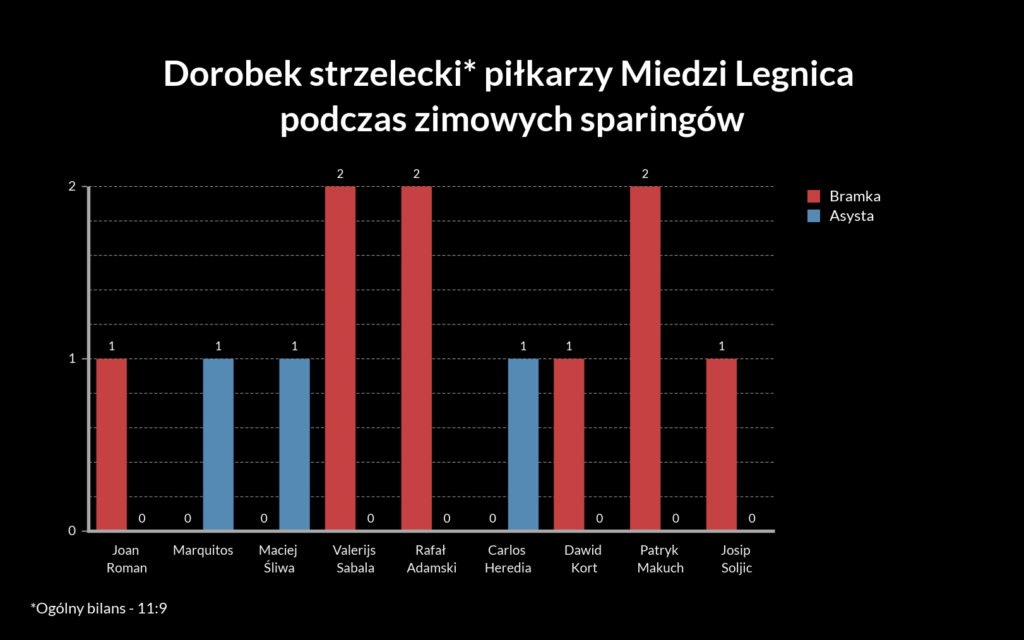 Tak jak choćby podczas sparingu z WKS-em, kiedy legnicki zespół pokazał charakter, wracając do gry po stracie dwóch wcześnie straconych goli. Wtedy najpierw rzut karny wykorzystał Dawid Kort, a później niezłą akcję indywidualną przeprowadził Rafał Adamski. Wydawało się, że kolejnym pozytywnym akcentem na przestrzeni zimowych sparingów w Polsce była bramka strzelona przez Valerijsa Sabalę w spotkaniu przeciwko Chrobremu Głogów. Łotewski napastnik zanotował bardzo słabą jesień z jedynie dwoma trafieniami na koncie, stąd każdy jego przejaw dobrej formy przed startem rundy wiosennej był mile widziany. Co ważne, 25-latek wpisał się na listę strzelców jeszcze podczas ostatniego testu ze słowackim MFK Mikulas dzięki świetnemu uderzeniu z dystansu.