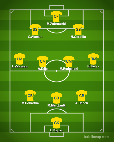 Trudno wytypować optymalne ustawienie Arki, zważając na transfery, jak i same przygotowania. Wyjściowe jedenastki przeważnie mocno się od siebie różniły. Pewnym punktem składu wydają się być Luis Valcarce oraz Mateusz Żebrowski, którzy rozegrali sporą liczbę minut podczas przedsezonowych meczów. Reszta pozostaje dość dużą niewiadomą. Naszym zdaniem powinno to wyglądać tak jak na załączonym niżej obrazku, jednakże jak mówiliśmy chwilę temu, jest to wyłącznie prawdopodobne ustawienie Arki Gdynia na zbliżający się sezon.