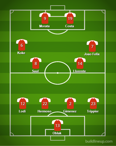Najważniejszą formacją dla Atletico pozostaje pomoc, w której Argentyńczyk dalej będzie stosować wariant z Koke na pozycji półskrzydłowego. Środek pola w postaci duetu Saul – Llorente zapewnia dobry balans między obroną a podłączaniem się do ataku. Oczywiście i tu możliwe są roszady – należy wspomnieć też o możliwości skorzystania z Hectora Herrery. Można więc wyobrazić sobie bardziej defensywny wariant z jednym nominalnym napastnikiem (Morata), podwieszonym Joao Felixem, a za nimi z kwartetem Koke, Herrera, Llorente, Saul.
