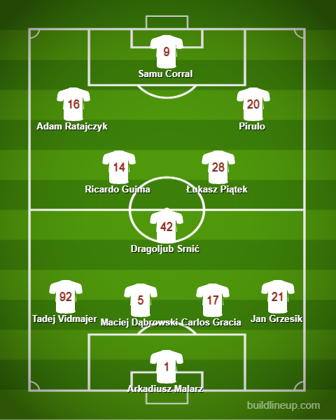 W dalszej części boiska wcale nie jest łatwo. Za środek pola według nas odpowiadać będą Guima, który po niełatwym początku sezonu zaczął grać na niezłym poziomie. Srnić, który po kontuzji w destrukcji wyglądał bardzo solidnie, oraz Piątek będący najbardziej doświadczonym piłkarzem z pola w szeregach biało-czerwono-białych. Ewentualnie decydując się na nieco bardziej ofensywny wariant, Moskal mógłby postawić na Michała Trąbkę w miejsce któregoś z defensywniejszych pomocników.