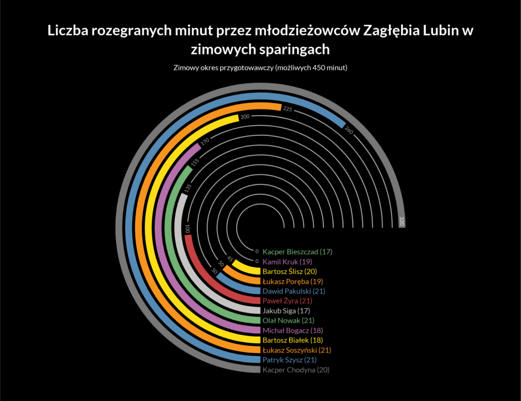 Oczywiście wśród piłkarzy przygotowujących się do rundy wiosennej nie zabrakło starych wyjadaczy na czele z Lubomirem Guldanem (37 l.) czy Jakubem Tosikiem (32 l.), jednak śmiało można powiedzieć, że to właśnie młodzieżowcy zdominowali okres zimowych sparingów Zagłębia. Stosując bowiem zasadę, że gracze z podstawowych jedenastek (szansę otrzymało 27 graczy – 24 z kadry, dwóch testowanych Brazylijczyków i nowy transfer) mogli rozegrać łącznie po 450 minut (82,5 h), aż 34,5% z pełnej puli przypadło piłkarzom poniżej 21. roku życia. Najwięcej czasu na boisku spędził 20-letni Kacper Chodyna (320).