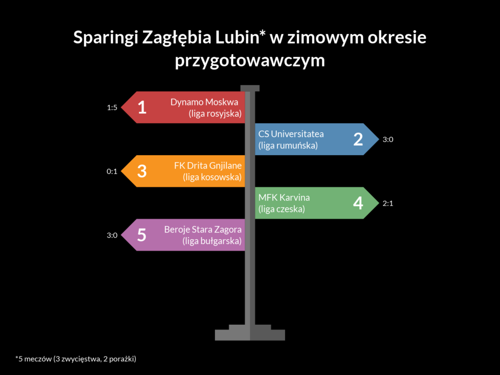 Tak jak duża część klubów z ekstraklasy „Miedziowi” udali się na zgrupowanie do Turcji. Dwutygodniowe, podczas którego pierwotnie miały odbyć się cztery sparingi. Trener Martin Sevela w trakcie obozu zdecydował jednak, że lubiński zespół rozegra dodatkowy sparing (wykaz meczów i wyników znajduje się na poniższym wykresie) z FK Drita Gnjilane (trzecia siła ligi kosowskiej). Tym samym Zagłębie Lubin zagwarantowało sobie 450 minut jednostki treningowej w warunkach meczowych o zróżnicowanym poziomie trudności. Od silnej ekipy z Rosji po przedstawiciela 52. ligi w Europie.