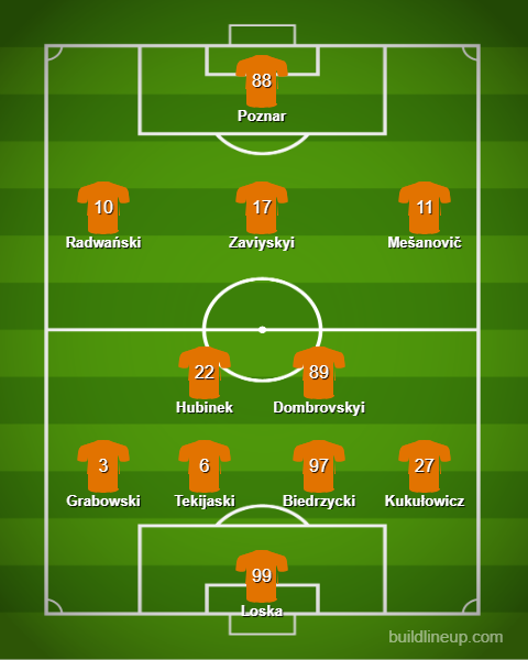 Wyżej ustawieni mogą być Michal Hubinek wraz z Andriyem Dombrovskyim. Dalej również nie powinno być większych zmian – za boczne strefy ofensywne odpowiedzialni mogą być Adam Radwański oraz Muris Mesanović. Na pozycji ofensywnego pomocnika postanowiliśmy umieścić nowy nabytek – Tarasa Zaviyskyiego – a na pozycji napastnika Tomasa Poznara.