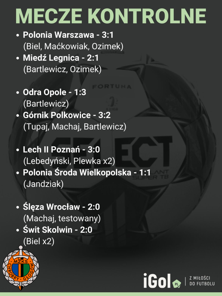 Piłkarze czternastej drużyny Fortuna 1. Ligi rozpoczęli zimowe przygotowania 7 stycznia. Do powrotu na ligowe boiska przygotowywali się na własnych obiektach. Również sześć z ośmiu spotkań kontrolnych rozegrano w Głogowie. Formę podopiecznych Piotra Plewni sprawdzili m.in. ligowi rywale z Warszawy, Opola czy Legnicy oraz Lech II Poznań i czworo trzecioligowców. Dwa mecze Chrobry Głogów rozegra w sobotę 10 lutego, a we wcześniejszych uległ jedynie Odrze Opole (1:3).