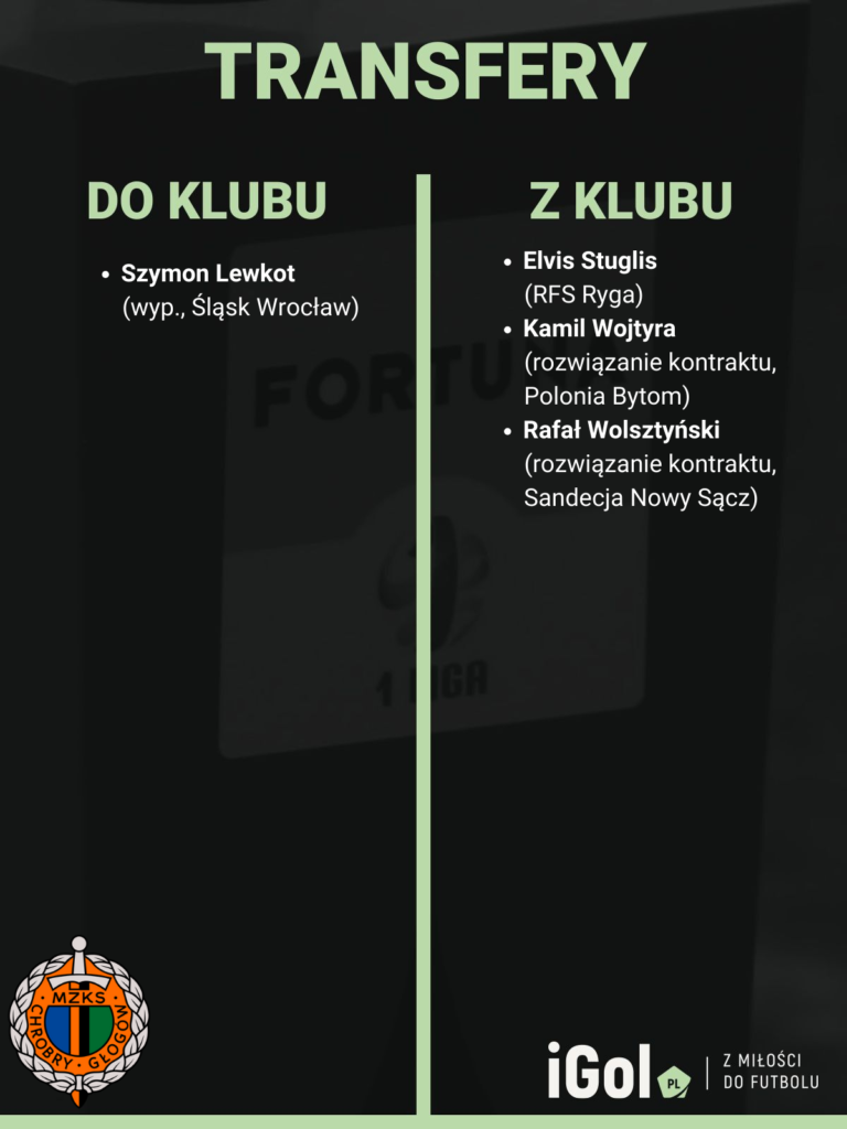 Jedynym zimowym wzmocnieniem Chrobrego jest na ten moment Szymon Lewkot. 24-latek jesienią wystąpił w barwach pierwszej drużyny Śląska Wrocław zaledwie przez siedem minut, grając częściej w trzecioligowych rezerwach. Łącznie w trakcie swojej kariery rozegrał ponad 70 spotkań na szczeblu centralnym w barwach Śląska oraz Górnika Łęczna. Wiosnę spędzi na wypożyczeniu w Fortuna 1. Lidze.