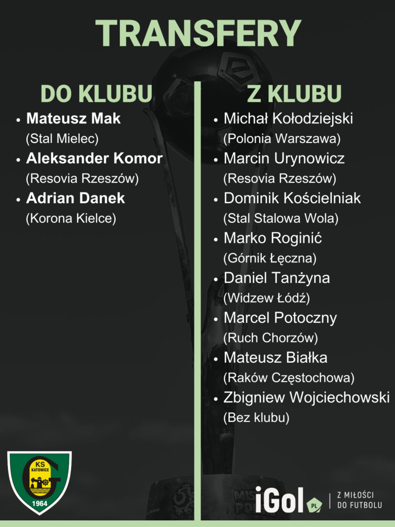 Katowiczanie raczej nie szaleli na rynku transferowym, jeśli chodzi o nowych piłkarzy. Miejsce Kołodziejskiego zajmie Aleksander Komor, dotychczas występujący w rzeszowskiej Resovii. Poniżej prezentujemy całą listę transferową katowiczan w trwającym letnim okienku: