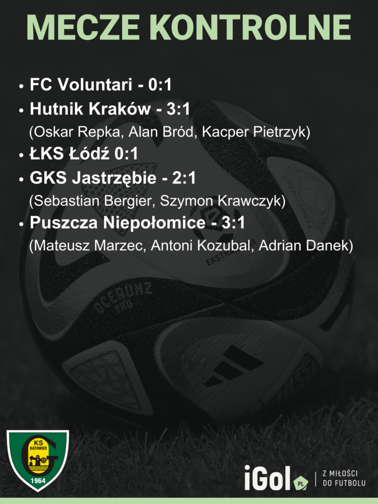 Co zastanawiające, GKS w każdym ze sparingów stracił dokładnie jednego gola. Warto jednak pamiętać, że wyniki sparingów powinniśmy traktować z dużą dozą dystansu. Poniżej możemy zobaczyć listę meczów kontrolnych z udziałem GKS-u Katowice w ostatnich tygodniach: