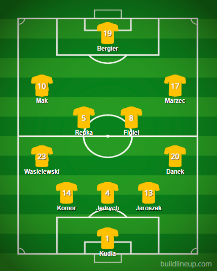 W środku pola rywalizacja będzie duża, szczególnie jeśli klubowi uda się dopiąć transfer Shuna Shibaty. Na razie postawiliśmy jednak na parę Repka – Figiel. Za lewą stronę w ataku odpowiadać będzie ściągnięty ze Stali Mielec Mateusz Mak, po przeciwległej stronie zagra Mateusz Marzec. Spośród dwóch możliwych opcji na pozycji napastnika zdecydowaliśmy się postawić na Bergiera, choć i Jakub Arak powinien otrzymać swoje minuty w tym sezonie, chociażby na kanwie zdobytych bramek w poprzedniej kampanii.