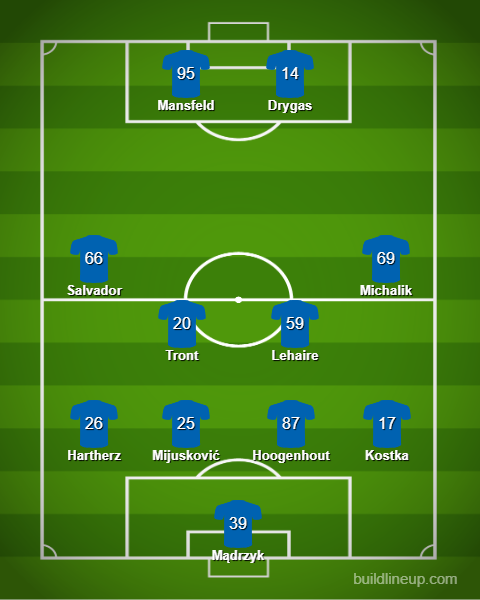 W środku pola wybór padł na Damiana Tronta oraz Mehdiego Lehaire, chociaż swoje szanse z pewnością dostaną również Tarsi Aguado oraz Iwo Kaczmarski. Na lewej stronie postanowiliśmy umieścić Ibana Salvadora, lecz jesienią sporo na tej pozycji grał również Kamil Antonik. Na prawej stronie pewniejszą pozycję ma z kolei Damian Michalik. W ataku Miedź ma spory wybór, aczkolwiek jej najważniejszym ogniwem w tym sezonie jest Kamil Drygas. Na początku sezonu najczęściej towarzyszył mu Emmanuel Agbor (który w innej formacji odgrywał rolę wysuniętego napastnika), lecz zdaje się, że pozycja Kameruńczyka osłabła na rzecz Marcela Mansfelda, który jesienią strzelił pięć bramek.