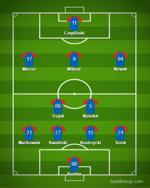 Za środek pola odpowiadać będą Miłosz Trojak wraz z Rafałem Niziołkiem. Wyżej zaś ustawieni zostaną Mateusz Marzec po lewej stronie, Tomas Mikinić na „dziesiątce”, natomiast Konrad Nowak na prawym skrzydle. Najwyżej ustawionym zawodnikiem Odry będzie z kolei Dawid Czapliński.